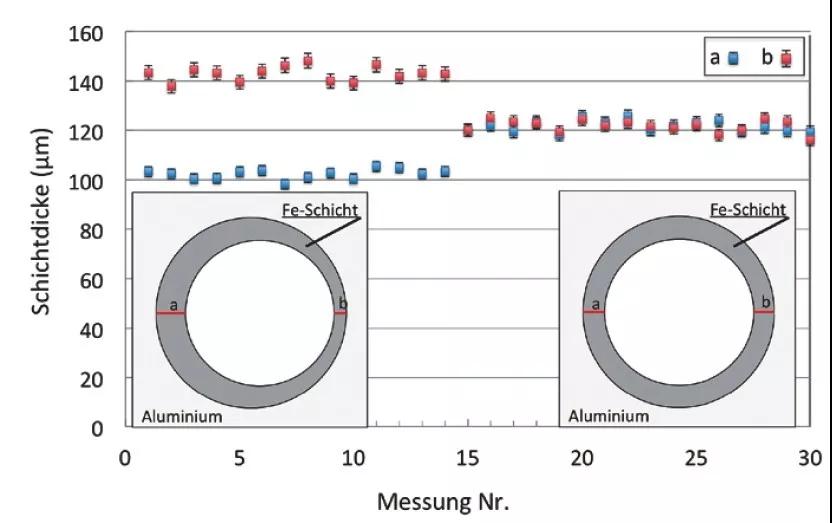 圖三 相對的點(diǎn)(a,b)處從底部到頂部測量油缸工作表面內(nèi)的涂層厚度。