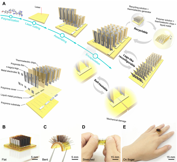 要點:模塊化的熱電片(Thermoelectric chips)插入到新型動態(tài)共價聚合物(Polyimine)基板上,通過液態(tài)金屬導(dǎo)線進行模塊間的電連接。