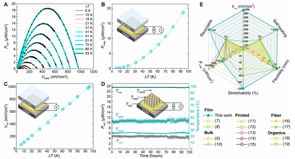 要點:1、95K溫差下開路電壓密度可達1V/cm2。熱端100℃下可以穩(wěn)定持續(xù)工作100小時。證明了在低溫廢熱(<100℃)回收應(yīng)用下的優(yōu)異的輸出性能和可靠性。2、在開路電壓、輸出功率、柔性、拉伸性、自愈合和可循環(huán)等指標下具有顯著的綜合優(yōu)勢。