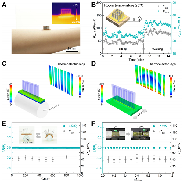 要點:1、在行走情況下,典型的運動腕帶大小的熱電器件可提供5V的開路電壓和12.5 μW的輸出功率,足夠直接驅(qū)動大部分低功率無線傳感器節(jié)點。2、器件在極端變形下,作為功能性部位的熱電材料上的應(yīng)變量極低。因此在承受超過1000次3.5mm小半徑彎曲疲勞試驗以及120%拉伸變形后,輸出性能不發(fā)生任何衰減。