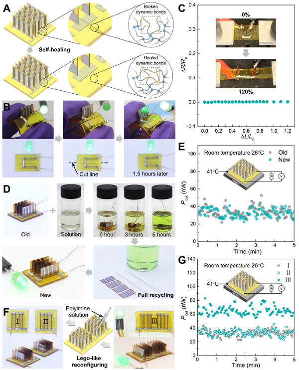圖4 (A,B,C)自愈合、(D,E)可循環(huán)和(F,G)類樂高可重構(gòu)的熱電器件
