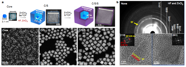 光學(xué)超表面開始進(jìn)入集成設(shè)備,可以增強(qiáng)和控制光波的發(fā)射、調(diào)制、動(dòng)態(tài)整形和檢測。在這項(xiàng)研究中,三星先進(jìn)技術(shù)研究院&斯坦福大學(xué)發(fā)現(xiàn)有機(jī)發(fā)光二極管(OLED)顯示器的體系結(jié)構(gòu)可以通過引入納米圖案的超表面反射鏡而完全重新設(shè)想。 在最終的meta-OLED顯示器中,不同的metasurface圖案定義了紅色,綠色和藍(lán)色像素,并確保從有機(jī)白色發(fā)光體中優(yōu)化提取這些顏色。這種新的體系結(jié)構(gòu)有助于創(chuàng)建使用可縮放納米壓印光刻技術(shù)的新興顯示應(yīng)用(例如增強(qiáng)現(xiàn)實(shí))所需的超高像素密度(每英寸> 10000像素)的設(shè)備。相對于標(biāo)準(zhǔn)的彩色濾光白色OLED,所制造的像素還具有兩倍的發(fā)光效率和出色的色純度。Metasurface-driven OLED displays beyond 10000 pixels per inch.(Science, 2020, DOI:10.1126/science.abc8530)2.三星先進(jìn)技術(shù)研究院Nature:高效穩(wěn)定的藍(lán)色量子點(diǎn)發(fā)光二極管
