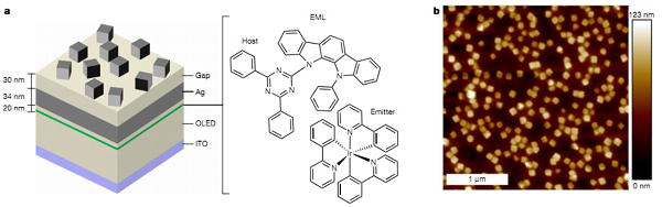 使用量子點(diǎn)對精確的顏色信息進(jìn)行可視化已經(jīng)探索了數(shù)十年,并且采用環(huán)保材料的商業(yè)產(chǎn)品目前可以用作背光源。然而,基于量子點(diǎn)的下一代電致發(fā)光顯示器需要開發(fā)有效且穩(wěn)定的無鎘的藍(lán)光發(fā)射裝置,由于藍(lán)光發(fā)射材料的光物理性能較差,這仍然是一個(gè)挑戰(zhàn)。三星先進(jìn)技術(shù)研究院介紹了ZnSe基藍(lán)色發(fā)光量子點(diǎn)的合成。作者發(fā)現(xiàn)氫氟酸和氯化鋅添加劑可通過消除ZnSe晶體結(jié)構(gòu)中的堆垛層錯(cuò)而有效提高發(fā)光效率。另外,通過液體或固體配體交換的氯化物鈍化導(dǎo)致緩慢的輻射復(fù)合,高的熱穩(wěn)定性和有效的電荷傳輸性質(zhì)。文章在發(fā)光二極管中構(gòu)造了具有梯度氯化物含量的雙量子點(diǎn)發(fā)射層,以促進(jìn)空穴傳輸,并且所得器件在理論極限下顯示出效率,高亮度和長使用壽命。作者認(rèn)為高效、穩(wěn)定的藍(lán)色量子點(diǎn)發(fā)光器件可以促進(jìn)使用量子點(diǎn)的電致發(fā)光全色顯示器的開發(fā)。Efficient and stable blue quantum dot light-emitting diode.(Nature, 2020, DOI:10.1038/s41586-020-2791-x)3.UDC Nature:等離子增強(qiáng)有機(jī)發(fā)光器件的穩(wěn)定性和亮度