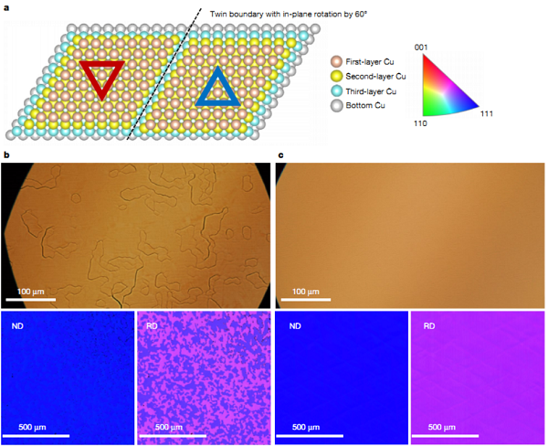 研究固體材料中電磁波和自由電子的共振相互作用的等離激元理論領(lǐng)域,由于等離激元材料中通常會發(fā)生大量損耗,因此尚未投入大規(guī)模商業(yè)應(yīng)用。由于其良好的色彩飽和度,通用的形狀因數(shù)和低功耗,有機(jī)發(fā)光器件(OLED)已被并入數(shù)十億個(gè)商業(yè)產(chǎn)品中,但在效率和穩(wěn)定性方面仍可以得到改善。盡管結(jié)合了有機(jī)熒光粉的OLED實(shí)現(xiàn)了內(nèi)部的電荷到光的統(tǒng)一轉(zhuǎn)換,但它們的折射率對比卻將設(shè)備外光子的可觀察部分降低了約25%。此外,在OLED操作期間,緩慢衰減的三重態(tài)激子和電荷的局部累積會在稱為老化的過程中逐漸降低設(shè)備的亮度,這可能會導(dǎo)致顯示屏出現(xiàn)“烙印”現(xiàn)象。同時(shí)提高設(shè)備效率和穩(wěn)定性對于OLED技術(shù)至關(guān)重要。美國UDC(Universal Display Corporation)演示了一種OLED,它利用等離子體系統(tǒng)的衰減率提高來提高設(shè)備穩(wěn)定性,同時(shí)通過結(jié)合基于納米粒子的外耦合方案從等離子體激元模式中提取能量來保持效率。使用原型磷光發(fā)射器,可以在與參考常規(guī)設(shè)備相同的亮度下將操作穩(wěn)定性提高兩倍,同時(shí)還可以從等離激元模式中提取16%的能量作為光。這個(gè)工作提高OLED穩(wěn)定性的方法避免了特定于材料的設(shè)計(jì),并且適用于當(dāng)前用于照明面板,電視和移動(dòng)顯示器的所有商用OLED。Plasmonic enhancement of stability and brightness in organic light-emitting devices.(Nature, 2020, DOI:10.1038/s41586-020-2684-z)4.臺積電&臺灣陽明交通大學(xué)&萊斯大學(xué)Nature:Cu(111)上的晶圓級單晶六方氮化硼六方氮化硼單層