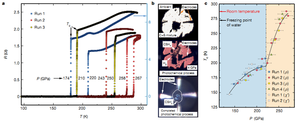 超薄二維(2D)半導(dǎo)體層狀材料為擴(kuò)展摩爾定律在集成電路中的晶體管數(shù)量提供了巨大的潛力。2D半導(dǎo)體的一個(gè)主要挑戰(zhàn)是避免從相鄰的電介質(zhì)形成電荷散射和捕獲位點(diǎn)。六方氮化硼(hBN)的絕緣范德華層提供了出色的界面電介質(zhì),有效地減少了電荷散射。最近的研究表明,在熔融金表面或塊狀銅箔上單晶hBN薄膜的生長。然而,由于熔融金的高成本,交叉污染以及過程控制和可擴(kuò)展性的潛在問題,因此不被工業(yè)所青睞。銅箔可能適用于卷對卷工藝,但不太可能與晶圓上的先進(jìn)微電子制造兼容。因此,可靠的直接在晶圓上生長單晶hBN薄膜的方法將有助于在工業(yè)中廣泛采用2D層狀材料。先前在Cu(111)金屬上生長hBN單層的嘗試未能實(shí)現(xiàn)單取向,當(dāng)這些層合并成flms時(shí)會導(dǎo)致有害的晶界。人們甚至認(rèn)為從理論上講,在諸如Cu(111)這樣的高對稱性表面上生長單晶hBN是不可能的。臺積電&臺灣陽明交通大學(xué)&萊斯大學(xué)報(bào)道了在兩英寸c面藍(lán)寶石晶片上的Cu(111)薄膜上成功完成了單晶hBN單層的外延生長。第一性原理計(jì)算結(jié)果證實(shí)了這一令人驚訝的結(jié)果,這表明通過hBN橫向?qū)又罜u(111)步驟可增強(qiáng)外延生長,從而確保hBN單層的單向性。所獲得的單晶hBN在底柵結(jié)構(gòu)中作為二硫化鉬和二氧化鉿之間的界面層并入,提高了晶體管的電性能。這種生產(chǎn)晶圓級單晶hBN的可靠方法為將來的2D電子學(xué)鋪平了道路。Wafer-scale single-crystal hexagonal boron nitride monolayers on Cu (111).(Nature, 2020, DOI:10.1038/s41586-020-2009-2)5.羅徹斯特大學(xué)&英特爾:氫化碳硫中的室溫超導(dǎo)