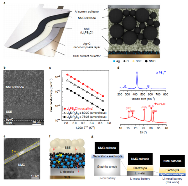 具有鋰金屬陽極的全固態(tài)電池是超越常規(guī)鋰離子電池性能的強(qiáng)大選擇。然而,不希望的鋰枝晶生長和低庫侖效率阻礙了它們的實(shí)際應(yīng)用。三星先進(jìn)研究院發(fā)現(xiàn),具有硫化物電解質(zhì)的高性能全固態(tài)鋰金屬電池是由不含過量鋰的Ag-C復(fù)合陽極實(shí)現(xiàn)的。薄的Ag-C層可以有效地調(diào)節(jié)Li的沉積,從而導(dǎo)致真正的長電化學(xué)循環(huán)性。在全電池演示中,作者使用了具有高比容量(> 210 mAh/g)和高面容量(> 6.8 mAh/cm2)的高Ni層狀氧化物陰極,以及一種銀輝石型硫化物電解質(zhì)。還引入了熱等靜壓技術(shù)以改善電極與電解質(zhì)之間的接觸。由此制備的原型袋式電池(0.6 Ah)表現(xiàn)出高能量密度(> 900 Wh/l),超過99.8%的穩(wěn)定庫侖效率和長循環(huán)壽命(1000次)。High-energy long-cycling all-solid-state lithium metal batteries enabled by silver-carbon composite anodes.