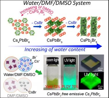 深圳大學微納光電子學研究院時玉萌課題組報道了水-DMF-DMSO三溶劑體系制備高質(zhì)量銫鉛溴鈣鈦礦的方法。該方法解決了強離子性的Cs離子在DMF/DMSO中難以溶解的問題。該方法可以不經(jīng)歷CsPbBr3中間相,而直接獲得高質(zhì)量的Cs4PbBr6熒光晶體,解決了傳統(tǒng)方法中Cs4PbBr6熒光晶體中內(nèi)嵌CsPbBr3納米晶的問題。所制備的Cs4PbBr6鈣鈦礦晶體的熒光產(chǎn)率達到76%,呈現(xiàn)出典型的幾何形狀依賴的熒光行為,與量子點的點狀熒光存在明顯的區(qū)別,明確了其綠色熒光更有可能來源于的Br-缺陷。