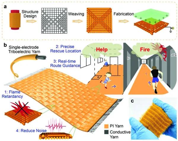 火災(zāi)事故已成為造成嚴(yán)重人身燒傷和毀滅性損失、威脅公共安全和財產(chǎn)安全的常見災(zāi)害之一。大量的火災(zāi)案例表明,提高人的逃生能力和材料的阻燃能力對減少人員傷亡具有重要意義。發(fā)生火災(zāi)時,大部分的救援電子設(shè)備由于電力中斷而無法使用。因此,迫切需要具有阻燃功能的自供電消防電子設(shè)備。在這種情況下,具有機(jī)械能收集和自供電傳感能力的摩擦電納米發(fā)電機(jī)(TENG)可以解決上述問題。此外,考慮到室內(nèi)環(huán)境的裝飾及其他功能需求,即具有阻燃功能的紡織品將是制造消防救援傳感器的理想材料。裝飾用紡織品具有降噪、輕量化、透氣性、可洗性、可調(diào)性、柔性等附加功能性能。因此,與薄膜或條狀電子器件相比,裝飾用紡織品將是室內(nèi)能量采集或信號監(jiān)測的更好選擇。目前,對織物TENGs的研究已有眾多的進(jìn)展,但仍存在幾個阻礙其進(jìn)一步應(yīng)用的關(guān)鍵問題有待解決。首先,在整個織物上浸涂功能材料制造的織物摩擦納米發(fā)電機(jī)(F-TENGs),織物通常硬度高,透水性極差,嚴(yán)重影響其穿著舒適性。其次,多層結(jié)構(gòu)的F-TENGs一般都是通過復(fù)雜的工藝制備而成,導(dǎo)致器件體積龐大且剛性不足,既不利于采集人體日常小微運(yùn)動的能量,也不適合軟性傳感和檢測的需求。因此,用連續(xù)的TENG紗線通過織機(jī)制造F-TENG,保證其透氣性、柔韌性和舒適性,是解決上述問題的關(guān)鍵。然而,最近報道的纖維(紗線)形TENG通常存在長度短、直徑大、細(xì)度不均勻等問題,不適合紡織機(jī)械加工技術(shù),直接影響織造效率和織物風(fēng)格。此外,對于F-TENG這種具有阻燃性能、降噪性能、透氣性等特殊功能的產(chǎn)品,目前還缺乏研究。因此,通過對紡紗工藝的控制以獲得細(xì)度均勻、細(xì)度細(xì)的紗線,以及織物結(jié)構(gòu)的設(shè)計及織造等均對功能性F-TENG的生產(chǎn)具有十分重要的意義。近日,在新疆大學(xué)青年教師馬麗蕓,中科院北京納米能源與系統(tǒng)研究所王中林院士,東華大學(xué)汪軍教授和廈門大學(xué)郭文熹副教授團(tuán)隊(duì)等合作,開發(fā)了一種基于阻燃包纏紗的3D蜂巢結(jié)構(gòu)機(jī)織摩擦電納米發(fā)電機(jī)(F-TENG)。該包纏紗采用連續(xù)空心錠花式捻線技術(shù),與傳統(tǒng)的紡織生產(chǎn)工藝兼容。由此制備的3D F-TENG可作為自供電的逃生和救援系統(tǒng),應(yīng)用于智能地毯,可精準(zhǔn)定位幸存者位置并指出逃生路線,及時協(xié)助受害者搜救。作為室內(nèi)裝飾,獨(dú)特的蜂巢織造結(jié)構(gòu)設(shè)計賦予了F-TENG織物優(yōu)秀的降噪能力。此外,結(jié)合其良好的機(jī)洗性、透氣性、阻燃性、耐用性、重復(fù)性等特點(diǎn),3D F-TENG在消防救援、可穿戴傳感器以及智能家居裝飾等方面都有很大的應(yīng)用潛力該成果以題為“A Machine-Fabricated 3D Honeycomb-Structured Flame-Retardant Triboelectric Fabric for Fire Escape and Rescue”發(fā)表在了Adv. Mater.上。