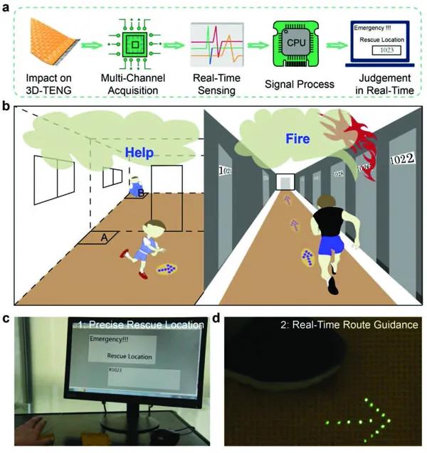 b)基于3D-F-TENG的智能地毯的示意圖,具有阻燃、精確救援定位、實(shí)時路線引導(dǎo)和降噪四大功能。