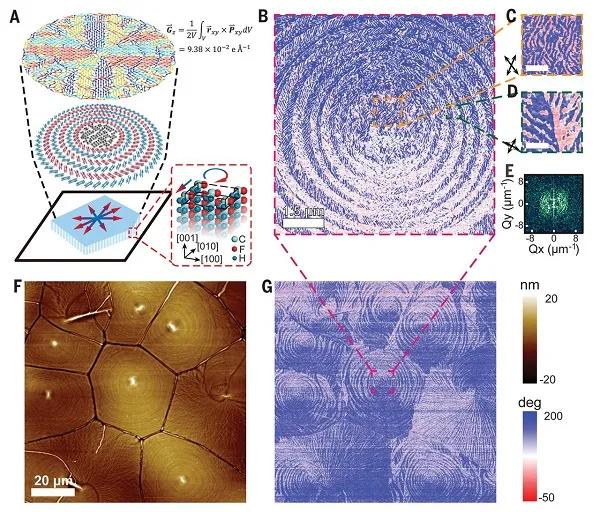 近期,清華大學的南策文和沈洋(共同通訊作者)等人在P(VDF-TrFE)鐵電聚合物中發(fā)現(xiàn)了自組織的環(huán)形拓撲紋理,其展現(xiàn)出了具有反耦合手性疇(anticoupled chiral domains)的同心圓拓撲結(jié)構(gòu)。