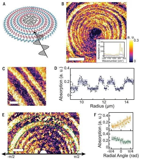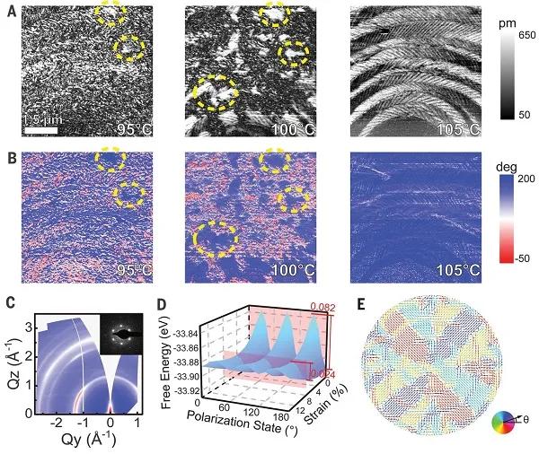 在過去很長一段時間里,研究者對自旋、電荷、軌道和晶格自由度的操縱能夠帶來例如高溫超導體等許多重大的科學發(fā)現(xiàn)。其中,對實空間序參量進行組裝形成環(huán)形拓撲圖案如磁性斯格明子(自旋)、極化渦旋(電荷)等至今仍然是基礎(chǔ)研究領(lǐng)域的熱門話題。然而,可否在鐵電聚合物中觀測到環(huán)形極化拓撲(toroidal polar topology)現(xiàn)象并理解辨識其驅(qū)動力到目前為止都困擾著研究人員。近期,清華大學的南策文和沈洋(共同通訊作者)等人在P(VDF-TrFE)鐵電聚合物中發(fā)現(xiàn)了自組織的環(huán)形拓撲紋理,其展現(xiàn)出了具有反耦合手性疇(anticoupled chiral domains)的同心圓拓撲結(jié)構(gòu)。研究發(fā)現(xiàn),彈性能、電能和梯度能的相互作用導致了與聚合物鏈正交的極化的旋轉(zhuǎn)和環(huán)形組裝,同時還能誘導沿著聚合物鏈的弛豫行為。這一環(huán)形極化拓撲引起了極化遠紅外波的周期性吸收,可實現(xiàn)在介觀尺度上對太赫茲波進行操縱。研究認為,這一發(fā)現(xiàn)不僅能夠為柔性鐵性體材料的設(shè)計提供指導,還能為發(fā)展具有多刺激轉(zhuǎn)變性質(zhì)的柔性電子器件提供新的機會。2021年03月05日,相關(guān)成果以題為“Toroidal polar topology in strained ferroelectric polymer”的文章在線發(fā)表在Science上。