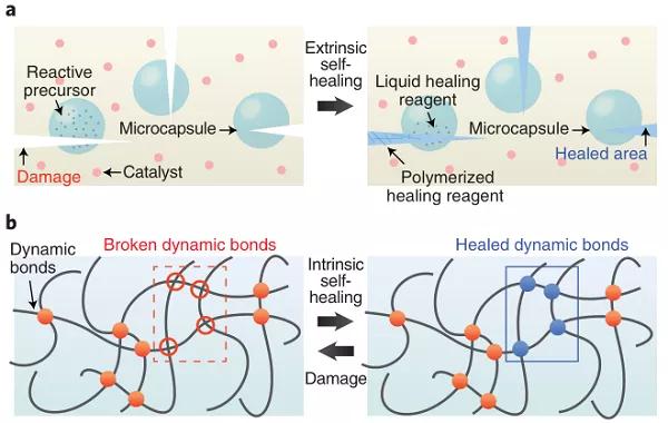 自修復(fù)材料可大致分為兩類(lèi):外源型(圖1a)和內(nèi)源型(圖1b)。當(dāng)分散的愈合劑(通常由聚合物基質(zhì)中的反應(yīng)性前驅(qū)物和催化劑組成)在損傷后釋放時(shí),會(huì)發(fā)生外源型自修復(fù)。這些愈合劑可以通過(guò)自主聚合反應(yīng)和交聯(lián)網(wǎng)絡(luò)的重建來(lái)修復(fù)損傷區(qū)域。盡管這種方法非常可靠,但它只允許材料有限次數(shù)愈合,而且通常不能在相同的位置重復(fù)愈合。相比之下,內(nèi)源型自修復(fù)材料不需要添加愈合劑,并且受損區(qū)域能夠通過(guò)聚合物基質(zhì)的重組重復(fù)愈合。此過(guò)程是通過(guò)動(dòng)態(tài)共價(jià)鍵或非共價(jià)鍵的再生以及受損界面上聚合物鏈的纏繞重建了基體。