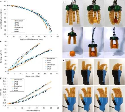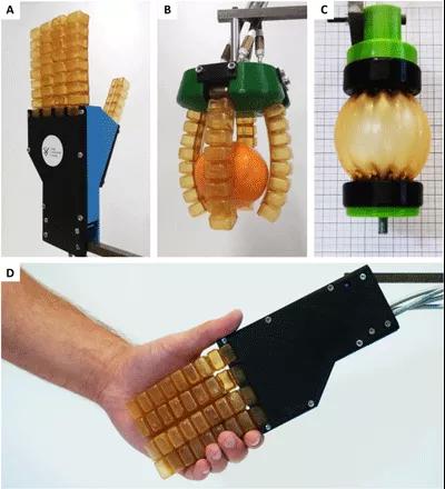 圖5. 軟氣動(dòng)執(zhí)行器。(A和D)自修復(fù)軟氣動(dòng)手。 (B)自修復(fù)軟氣動(dòng)抓手。 (C)自修復(fù)等褶狀氣動(dòng)人工肌肉。