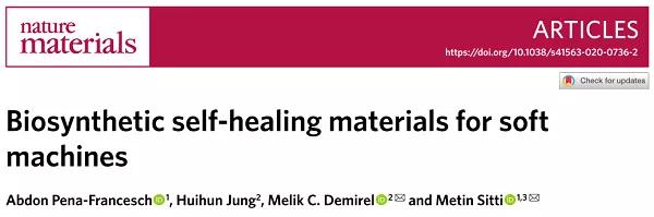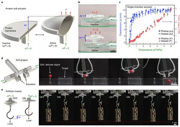 當(dāng)前的自修復(fù)材料具有限制其實(shí)際應(yīng)用的缺點(diǎn),例如低的治療強(qiáng)度(低于兆帕)和長(zhǎng)的治療時(shí)間(小時(shí))。 針對(duì)這個(gè)問(wèn)題德國(guó)馬普研究所的Melik C. Demirel和來(lái)自美國(guó)賓州州立大學(xué)的Metin Sitti團(tuán)隊(duì)基于魷魚(yú)腕足吸盤(pán)中的環(huán)狀齒蛋白序列,通過(guò)蛋白質(zhì)工程技術(shù),成功制備出了兼具高愈合后強(qiáng)度、超快愈合速度(愈合后強(qiáng)度達(dá)到2-23 MPa,愈合時(shí)間1s)和生物可降解的自愈合彈性體材料,并將這種材料用于制備氣動(dòng)人工肌肉和柔性抓手。這種材料可以在一秒鐘內(nèi)通過(guò)局部加熱自我修復(fù)微觀和宏觀機(jī)械損傷。并且經(jīng)過(guò)系統(tǒng)優(yōu)化,可以改善其氫鍵結(jié)合的納米結(jié)構(gòu)和網(wǎng)絡(luò)形態(tài),具有可編程的愈合特性,超過(guò)其他天然和合成軟材料的數(shù)量級(jí)。