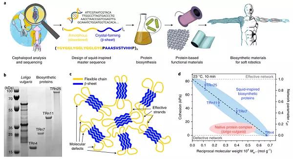 圖 7. 蛋白鏈結(jié)構(gòu)及其高級(jí)折疊結(jié)構(gòu)。魷魚(yú)蛋白質(zhì)的分析,魷魚(yú)啟發(fā)的主序列的設(shè)計(jì)以及蛋白質(zhì)庫(kù)的生物合成,產(chǎn)生了基于蛋白質(zhì)的功能性自修復(fù)材料,適用于軟促動(dòng)器和機(jī)器人應(yīng)用。b,天然Loligo vulgaris蛋白復(fù)合物和生物合成TRn4,TRn7,TRn11和TRn25多肽的蛋白大小。c,生物合成串聯(lián)重復(fù)多肽的納米結(jié)構(gòu)由通過(guò)柔性鏈(黃色)連接的β-片狀納米晶體網(wǎng)絡(luò)(藍(lán)色)組成,具有分子缺陷(懸空的末端和環(huán))。d,由于優(yōu)化的網(wǎng)絡(luò)形態(tài),魷魚(yú)啟發(fā)的蛋白質(zhì)(在室溫下)的自愈特性比天然蛋白質(zhì)得到的改善。誤差線,標(biāo)準(zhǔn)偏差(n = 5)。