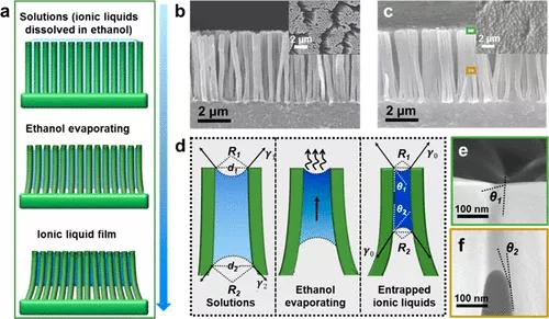 圖9. 基于液膜的超耐用應(yīng)變傳感器的制造。(a)液膜的形成過(guò)程。(b,c)分別具有和不具有離子液體膜的微絨毛的橫截面SEM圖像。插圖:頂視圖SEM圖像。(d)分析驅(qū)動(dòng)力。(e,f)液膜頂部和底部的彎液面夾在微絨毛之間。