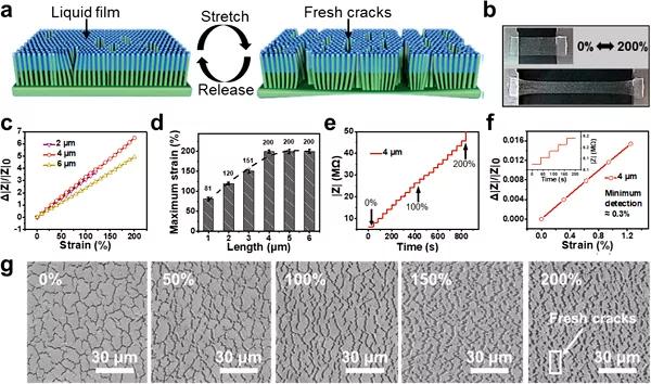 電阻應(yīng)變傳感器具有出色的靈敏度和順應(yīng)性,因此在柔性和可拉伸電子產(chǎn)品的開(kāi)發(fā)中起著至關(guān)重要的作用。然而,由于固體導(dǎo)電層與聚合物之間的低粘合強(qiáng)度以及常規(guī)固體導(dǎo)電層內(nèi)部不可彌補(bǔ)的干摩擦,這種傳感器的耐用性較差。針對(duì)該問(wèn)題,中國(guó)科學(xué)院理化技術(shù)研究所生物啟發(fā)智能界面科學(xué)實(shí)驗(yàn)室田野團(tuán)隊(duì)受動(dòng)物角膜淚膜的結(jié)構(gòu)和出色的耐磨性的啟發(fā),設(shè)計(jì)了基于由改性聚二甲基硅氧烷(PDMS)制成的仿生微絨毛上形成的均勻自修復(fù)無(wú)磨損液態(tài)膜的超耐久應(yīng)變傳感器。將包含離子液體的乙醇溶液添加到PDMS微絨毛中,由于表面化學(xué)性質(zhì)和特殊結(jié)構(gòu),該微絨毛具有超親液性。在蒸發(fā)過(guò)程中,離子液體通過(guò)壓力向上驅(qū)動(dòng),并形成連續(xù)的導(dǎo)電膜。作為傳感層,當(dāng)反復(fù)拉伸和釋放時(shí),由于濕摩擦而使毛細(xì)管穩(wěn)定化的液膜無(wú)損,并且在釋放后,由于毛細(xì)管力引起的自我修復(fù)能力,裂縫將完全恢復(fù),從而使應(yīng)變傳感器能夠具有超過(guò)22500個(gè)裝卸循環(huán)的高耐久性。這項(xiàng)工作提出了一種構(gòu)建超耐用電子產(chǎn)品的方法。