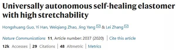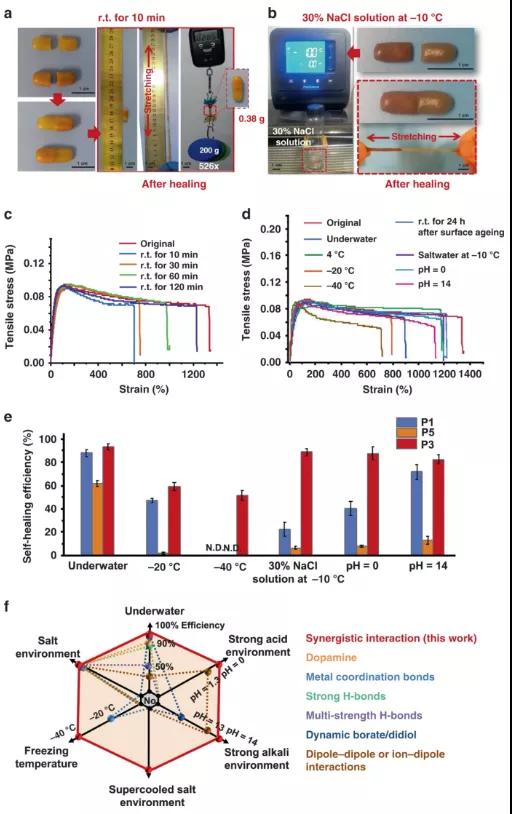 皮膚和肌肉在受到損傷時(shí)會(huì)自動(dòng)自我修復(fù),而這一能力一直是科學(xué)家夢(mèng)寐以求想賦予材料的一種特殊性能。然而,目前的可修復(fù)材料的大多數(shù)設(shè)計(jì)都需要外部能量才能愈合或者這些材料的機(jī)械強(qiáng)度較弱。動(dòng)態(tài)超分子材料可以在一定程度上解決以上問(wèn)題,它在室溫下無(wú)需外部條件便可以發(fā)生自我修復(fù)。但是,具有自修復(fù)性能的動(dòng)態(tài)超分子材料往往不能適用于極端條件,原因在于:(i)當(dāng)可修復(fù)材料在水下受傷或破裂時(shí),水分子會(huì)干擾動(dòng)態(tài)鍵的重新連接,導(dǎo)致材料無(wú)法修復(fù)。(ii)在凍結(jié)條件下,可修復(fù)材料中鍵的動(dòng)態(tài)特性遇到很大的障礙,從而極大地限制了自修復(fù)過(guò)程。(iii)一些自我修復(fù)的相互作用易受pH值變化的影響。針對(duì)以上問(wèn)題,來(lái)自天津大學(xué)化工學(xué)院張雷教授團(tuán)隊(duì),通過(guò)在聚二甲基硅氧烷聚合物中協(xié)同結(jié)合多強(qiáng)度氫鍵和二硫鍵交換,設(shè)計(jì)出一種具有普遍自愈性和高拉伸性的超分子彈性體。它可以在極端條件下實(shí)現(xiàn)快速的自主自修復(fù),包括在室溫、超低溫(?40°C)、水下、過(guò)冷的高濃度鹽水(-10°C下30%NaCl溶液中)和強(qiáng)酸/堿環(huán)境(pH=0或14)。這些性質(zhì)歸因于動(dòng)態(tài)強(qiáng)氫鍵和弱氫鍵與強(qiáng)二硫鍵的協(xié)同相互作用。