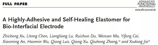 柔性可拉伸電極在可穿戴電子領(lǐng)域中具有廣泛的應(yīng)用。近年來(lái),隨著醫(yī)療器械的發(fā)展,人們對(duì)可拉伸電極材料的功能性要求也越來(lái)越高。如用于監(jiān)測(cè)生物電信號(hào)的電極材料不僅需要優(yōu)異的彈性和導(dǎo)電性,還需要和生物界面具有優(yōu)異的粘附性來(lái)保證信號(hào)的穩(wěn)定性。目前所采用的電極所采用的基體材料通常采用硅橡膠類(lèi)彈性體,這類(lèi)聚合物在具有高彈性的時(shí)候并不能具備粘附性。因此制備一種本身具有粘性的彈性體具有重要的意義。針對(duì)這一問(wèn)題,南京大學(xué)化學(xué)化工學(xué)院張秋紅副教授、賈敘東教授課題組將帶有二羥基的多巴胺基團(tuán)引入到以聚四氫呋喃醚基聚氨酯體系中,利用體系內(nèi)的動(dòng)態(tài)氫鍵和多巴胺間相互作用,制備了一種新型的“粘”彈體(斷裂形變5100%,斷裂強(qiáng)度1.9 MPa,粘附強(qiáng)度62 kPa)。
