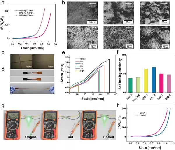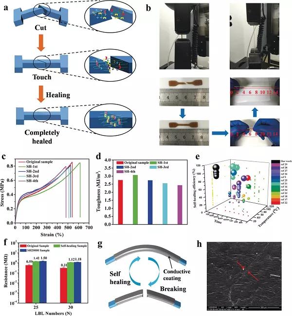 圖13. 自修復(fù)性能測(cè)試。a)自我修復(fù)過(guò)程。b)拉伸前后自我修復(fù)的多氫鍵彈性體的照片。c)原始,第一,第二,第三和第四愈合的多氫鍵彈性體的典型應(yīng)力-應(yīng)變曲線和d)韌性。e)比較不同自修復(fù)聚合物彈性體的機(jī)械自修復(fù)效率。f)25和30 LBL循環(huán)的應(yīng)變傳感器的電氣自修復(fù)性能。g)電氣自我修復(fù)過(guò)程。h)帶有25個(gè)LBL循環(huán)的已修復(fù)傳感器的SEM圖像。