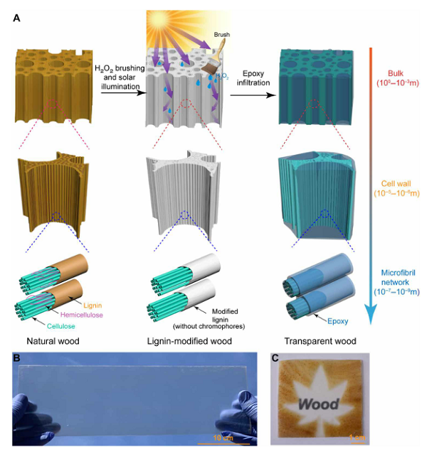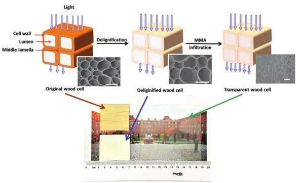 透明木材是一種多功能木質(zhì)復(fù)合材料,關(guān)于透明木材的第一份報(bào)道來源于Fink公司于1992年編寫的木材形態(tài)學(xué)研究。后來,通過將機(jī)械性能與光學(xué)透射率研究相結(jié)合,提出了透明木材在工程相關(guān)領(lǐng)域的應(yīng)用。由于在基本木材特性基礎(chǔ)上增加了光學(xué)透射率,透明木材有助于木材解剖學(xué)研究,還可用于透光智能建筑、電子設(shè)備,以及光伏電池和光源等光子設(shè)備。
