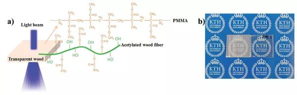 圖2 (a)改性高透明木材結(jié)構(gòu)的示意圖;(b)非乙酰化透明木材(左)和乙酰化透明木材(右)。