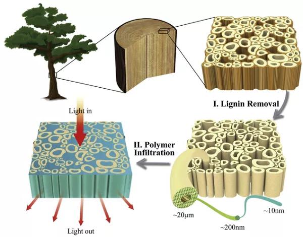圖7 通過去除木質(zhì)素和隨后的聚合物滲透制造具有高光學(xué)霧度的透明木材的示意圖。
