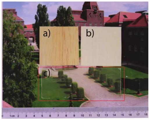 圖10 (a)化學(xué)處理前的輕木照片;(b)脫木質(zhì)素的木材;(c)透明木材(沒有染料分子嵌入)。