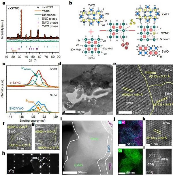 (c)煅燒前c-SYNC和“原始” SNC/YWO的Sr 3d軌道的XPS圖譜;(e-g)YWO,SWO和SYNC相界面的HR TEM圖像;(h)f中SYNC相的[110]區(qū)域軸的SEAD模式;(k,l)STEM圖像和相應的SWO相FFT圖像。