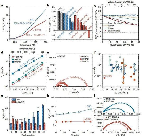 (a)c-SYNC和SNC在100至800℃的空氣中的熱膨脹曲線;(b)SNC,SYNC,x wt%SWO-SNC和x wt%YWO-SNC組成的TECs,質量百分比x在0到100之間變化;(d)在800、900和1000℃燒制的c-SYNC電極的極化電阻;(e)在500、600和650℃下c-SYNC電極的阻抗譜;(f)在600℃條件下,各種ORE材料的RP與TEC的匯總圖;(g)基于c-SYNC和SNC的對稱電池的ASR值與電極厚度的函數(shù)關系;(h)40μm厚c-SYNC和SNC對稱電池在600℃的空氣中測量200小時的Rp;(i)耐久性試驗前后c-SYNC和SNC電極的EIS圖。