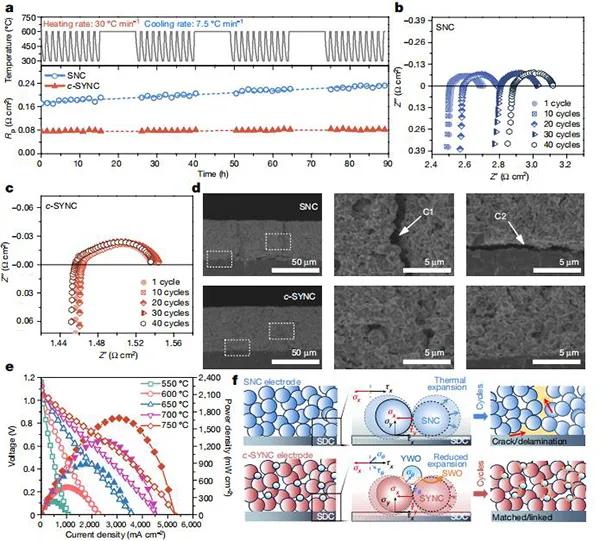 (a)基于SNC和c-SYNC的對稱電池電極在600℃到300℃之間的40個熱循環(huán)中的ASR(RP)響應(在最低30℃ min-1的加熱速率和大約最低7.5℃ min-1的被動冷卻下90小時的總累計試驗);(b,c)循環(huán)后SNC(b)和c-SYNC(c)對稱電池的代表性EIS曲線;(e)有40μm厚c-SYNC陰極的陽極支撐的H2/空氣SOFC的I-V和I-P(I,電流密度;V,電壓;P,功率密度)曲線;(f)提出了在c-SYNC復合電極TEC補償熱機械增強的機理,并對粒子相互作用和力的分析進行了放大,對比了SNC與c-SYNC的行為。 文章轉載自微信公眾號:材料人
