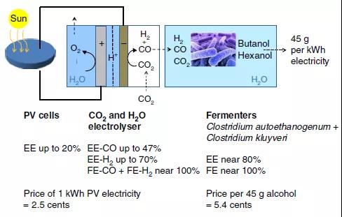 針對這一問題,德國西門子公司的Guenter Schmid(通訊作者)團(tuán)隊[1]利用了可商用的銀基氣體擴(kuò)散電極。該電極通常使用在工業(yè)規(guī)模的氯-堿電解過程中,而研究人員則以此電極作為二氧化碳電解槽的陰極。檢測發(fā)現(xiàn),由此形成的電解槽在超過1200小時的連續(xù)運行后,電流密度依然可高達(dá)300?mA cm–2。這一二氧化碳電解槽可被連接到發(fā)酵模塊(fermentation module),這樣一來,從電解槽出來的合成氣可以直接轉(zhuǎn)化成具有高碳選擇性的丁醇和己醇。研究計算顯示。光伏電能、二氧化碳和水轉(zhuǎn)變成醇類的法拉第效率可接近達(dá)到100%。利用這一雜化系統(tǒng),研究表示人工光合成高價值化學(xué)品(丁醇/己醇)可能達(dá)到幾萬噸每年的產(chǎn)量,已經(jīng)接近工業(yè)化規(guī)模水平。