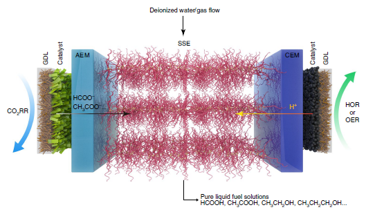 萊斯大學(xué)的汪淏田(通訊作者)團(tuán)隊[2]利用固態(tài)電解質(zhì)在電池中實現(xiàn)了二氧化碳連續(xù)電催化轉(zhuǎn)化生成純液體燃料溶液。在這個過程中,電化學(xué)產(chǎn)生的陽離子(如氫離子)和陰離子(如甲酸根離子)相互結(jié)合形成不含其他離子的純產(chǎn)物溶液。在陰極上利用甲酸選擇性(法拉第效率大于90%)和極易規(guī)模化的鉍催化劑,研究證實了該過程可生產(chǎn)濃度達(dá)12M的純甲酸溶液。研究也展示了長達(dá)100小時的0.1M甲酸的連續(xù)穩(wěn)定生產(chǎn),同時催化選擇性和活性幾乎不變。同樣地,利用銅催化劑,研究還實現(xiàn)了如醋酸等其他無電解質(zhì)液體產(chǎn)物。這一工作在可規(guī)模化電池上實現(xiàn)了二氧化碳電催化直接還原成甲酸的過程,展示了二氧化碳電還原的工業(yè)化前景。