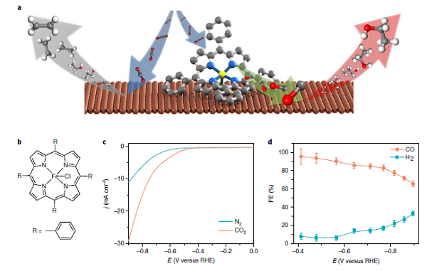 多倫多大學(xué)的Edward H. Sargent(通訊作者)課題組[3]提出了一種分子-金屬催化劑表面的協(xié)同催化劑設(shè)計。這一設(shè)計旨在建立富含反應(yīng)中間體的局部環(huán)境,從而提高從二氧化碳和水電合成乙醇的能力。研究人員首先利用一系列能夠催化二氧化碳形成一氧化碳的卟啉基金屬復(fù)合物對銅表面進(jìn)行功能化,再利用DFT計算和拉曼、X射線等譜學(xué)表征,發(fā)現(xiàn)局部一氧化碳展現(xiàn)出高濃度特點,能夠有利于碳碳耦合、控制反應(yīng)路徑以高效生產(chǎn)乙醇。驗證實驗的結(jié)果,二氧化碳-乙醇轉(zhuǎn)變的局部電流密度也達(dá)到了(124?mA?cm?2)(?0.82 V vs RHE),但由于抑制氫氣生成的問題沒有解決,其法拉第效率略有下降(41%)。這一催化劑后又被集成到薄膜電極組裝系統(tǒng),也實現(xiàn)了13%左右的全局能量效率。