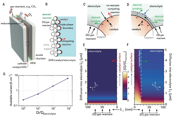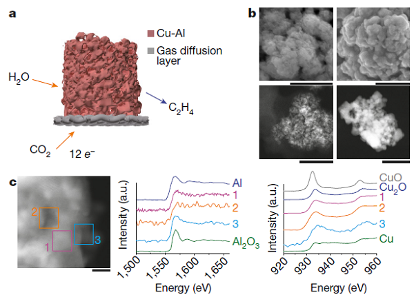 二氧化碳電化學(xué)還原產(chǎn)生C2化學(xué)品的另外一個挑戰(zhàn)是生成的氣體都是疏水的,而產(chǎn)物反應(yīng)又需要水分子的參與。氣體往往需要擴(kuò)散穿過液態(tài)電解質(zhì)與催化劑表面接觸,這也限制了C2生產(chǎn)能力的進(jìn)步。為了克服這一問題,多倫多大學(xué)的Edward H. Sargent和David Sinton(共同通訊作者)合作[4]將離子聚合物(ionomer)組裝體和銅電催化劑結(jié)合形成新型3D催化劑。這一復(fù)合催化劑具有離子聚合物體相異質(zhì)結(jié)(CIBH)結(jié)構(gòu),能夠分離氣體、離子和電子輸運。這一結(jié)構(gòu)包含金屬層和超精細(xì)離子聚合物層,其中離子聚合物層進(jìn)行了疏水和親水功能化,能夠組裝形成結(jié)構(gòu)差異化的形貌,并有利于氣體和離子在金屬表面的輸運:氣體傳輸可通過疏水區(qū)域的側(cè)鏈進(jìn)行提升,使氣體擴(kuò)散得以擴(kuò)展;同時,水的吸收和離子出現(xiàn)在親水區(qū)域。由此帶來的結(jié)果是,活性位點附近的氣體反應(yīng)物、離子和電子大幅增加,反應(yīng)界面由亞微米尺度提升到了幾個毫米水平。以此為策略設(shè)計的催化劑在7M磷酸鹽電解質(zhì)中實現(xiàn)了高效的二氧化碳電還原反應(yīng),乙烯的局部電流密度可以到達(dá)1.3 A cm?2(陰極能量效率為45%)。這一電流密度是迄今為止在二氧化碳生產(chǎn)C2化學(xué)品過程中觀測到的最高值,已經(jīng)可以完全滿足工業(yè)規(guī)模相關(guān)的應(yīng)用需求。