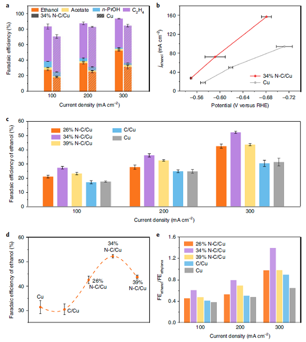 而在二氧化碳電還原反應(yīng)中,乙醇和乙烯是兩種主要的C2競爭產(chǎn)物。一般認(rèn)為,這兩種產(chǎn)物衍生自共同的關(guān)鍵中間體(HOCCH*),HOCCH*中碳氧鍵斷裂產(chǎn)生了乙烯。對二氧化碳電還原反應(yīng)進(jìn)行技術(shù)經(jīng)濟(jì)分析發(fā)現(xiàn),只有當(dāng)局部電流密度超過100 mA cm?2時,C2產(chǎn)物才會開始產(chǎn)生經(jīng)濟(jì)效益。這意味著即使二氧化碳電還原反應(yīng)的全局電流密度超過10 mA cm?2,乙醇產(chǎn)物的法拉第效率需要進(jìn)一步提高才能推進(jìn)商業(yè)化。Edward H. Sargent(通訊作者)的團(tuán)隊[5]報道了一類可實現(xiàn)52%左右乙醇法拉第效率和31%乙醇陰極能量效率的催化劑。研究發(fā)現(xiàn),在銅表面涂覆氮摻雜碳層,賦予了催化劑強(qiáng)大的供電子能力,可以在HOCCH*中提高碳碳鍵的耦合、抑制碳氧鍵的斷裂,從而增強(qiáng)二氧化碳電還原過程中的乙醇產(chǎn)物選擇性。根據(jù)該研究的數(shù)據(jù),利用氮摻雜碳層改性后銅催化劑在電流密度超過100 mA cm?2時的總法拉第效率高達(dá)83%,乙醇的法拉第效率也大幅提高,超過了已有報道的最佳數(shù)值(41%)。