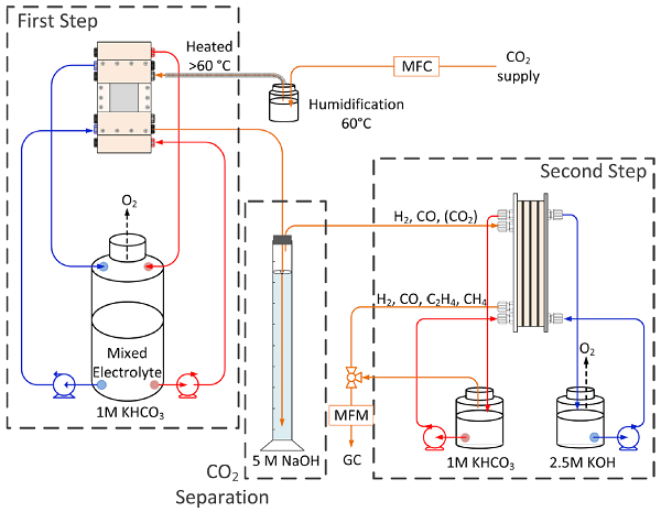 而近期,西門子公司的N. S. Romero Cuellar(通訊作者)等人[7]提出了一種新型的兩步電解法,展示了其工業(yè)化前景。作者利用兩塊分別以銀和銅作為氣體擴(kuò)散電極的液流電池,將兩步二氧化碳電化學(xué)還原過程進(jìn)行集成化。在這一集成系統(tǒng)中,作者實現(xiàn)了電解質(zhì)、氣體和電極之間的巨大三相邊界區(qū)域,由此可以在工業(yè)級電流密度水平操作運行電化學(xué)還原過程。作者首先利用電壓/電流密度變化線掃分別研究兩個電解槽;而在分析第二個電解槽時,作者假定供應(yīng)第一步的二氧化碳不會全部轉(zhuǎn)化成一氧化碳,即第一步的產(chǎn)物氣體是一氧化碳/二氧化碳的混合氣。以此假定,作者研究了不同比例混合氣的電還原反應(yīng),并發(fā)現(xiàn)二氧化碳的占比越高一氧化碳轉(zhuǎn)換成多碳產(chǎn)物的效率越低。因此,作者在第二步中用氫氧化碳吸附二氧化碳,從而有效增加集成系統(tǒng)的全局法拉第效率。根據(jù)計算,這一兩步策略的多碳產(chǎn)物(C2和C3)累計法拉第效率可以達(dá)到62%。