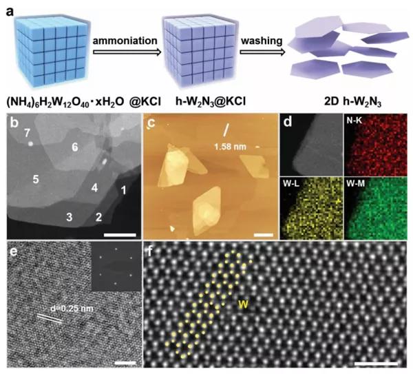 2D過渡金屬氮化物,尤其是富氮的氮化鎢(WxNy,y>x),例如W3N4和W2N3,由于大量的W-N大大提高了催化活性,具有很大的產(chǎn)氫反應(yīng)(HER)潛力。但是,由于W-N鍵的形成能量大,因此合理合成2D富氮氮化鎢具有挑戰(zhàn)性。本文中,通過鹽模板法在大氣壓力下合成了超薄的2D六角形W2N3(h-W2N3)薄片。