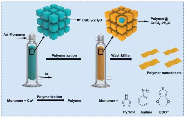 2D過渡金屬氮化物,尤其是富氮的氮化鎢(WxNy,y>x),例如W3N4和W2N3,由于大量的W-N大大提高了催化活性,具有很大的產(chǎn)氫反應(yīng)(HER)潛力。但是,由于W-N鍵的形成能量大,因此合理合成2D富氮氮化鎢具有挑戰(zhàn)性。本文中,通過鹽模板法在大氣壓力下合成了超薄的2D六角形W2N3(h-W2N3)薄片。由于KCl和h-W2N3之間的強(qiáng)相互作用和疇匹配外延,h-W2N3的形成能可以大大降低。2D h-W2N3對(duì)陰極HER表現(xiàn)出出色的催化活性,起始電勢(shì)為-30.8 mV,對(duì)于10 mA/cm2,其超電勢(shì)為-98.2 mV。Atmospheric-Pressure Synthesis of 2D Nitrogen-Rich Tungsten Nitride.(Adv. Mater., 2018, DOI:10.1002/adma.201805655)2.J. Mater. Chem. A:通過鹽模板方法大規(guī)模合成可調(diào)節(jié)尺寸和厚度的導(dǎo)電聚合物納米片