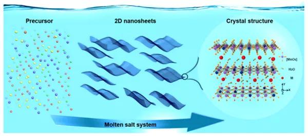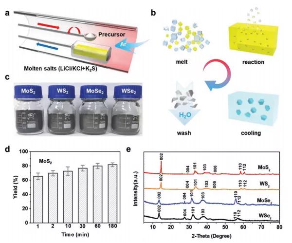 導(dǎo)電聚合物納米片由于其獨(dú)特的光學(xué)和電學(xué)性質(zhì)而在許多有趣的應(yīng)用中很有希望。然而,以容易的方式來制造具有大的可擴(kuò)展性的特征的尺寸和厚度可調(diào)的導(dǎo)電聚合物納米片仍然是挑戰(zhàn)。作者開發(fā)了一種在單體氣體與CuCl2·2H2O鹽之間的氣固界面上大規(guī)模合成各種導(dǎo)電聚合物納米片的新方法。所獲得的聚合物納米片的厚度可以從2.1nm調(diào)整到8.8nm。此外,在CuCl2·2H2O膜的表面制備了高導(dǎo)電性,柔韌性和大面積的PPy膜,其透明度為85%。PPy納米片組裝的獨(dú)立式電極表現(xiàn)出320 F/cm3的高體積電容和高倍率能力。這種簡(jiǎn)便且成本有效的方法可以大量生產(chǎn)導(dǎo)電聚合物納米片,并有望在潛在的實(shí)際應(yīng)用中使用。Large-scale synthesis of size- and thickness-tunable conducting polymer nanosheets via a salt-templated method.(J. Mater. Chem. A, 2019, DOI:10.1039/c9ta08617j)3.Adv. Funct. Mater.:熔融鹽法大規(guī)模生產(chǎn)高質(zhì)量的過渡金屬二硫?qū)僭鼗锛{米片