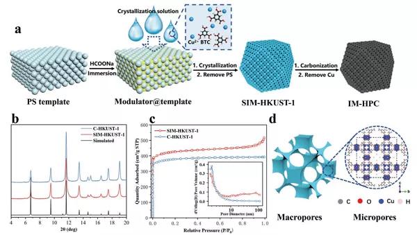 二維(2D)層狀MnO2材料由奇異的電子特性和帶有堿金屬離子的活性位組成,為開發(fā)具有化學(xué)修飾的催化劑提供了一個(gè)全面的平臺(tái)。值得注意的是,含K+的層狀MnO2催化劑已被證明是甲醛催化氧化(HCHO)的強(qiáng)力候選者。揭示活性部位上的堿金屬離子的影響對(duì)于了解反應(yīng)物與活性中心之間的相互作用至關(guān)重要。通過將分析工具與周期性計(jì)算密度泛函理論模型相結(jié)合,通過比較三種典型的插入的堿金屬離子(Na+,K+,和Cs+)層狀MnO2材料。這些材料是通過熔融鹽法合成的,具有高收率,較大的橫向尺寸和納米厚度。文章證明了堿金屬離子可以通過CsMnO(1.94 eV)<KMnO(1.97eV)<NaMnO(2.07eV)<理想的MnO2表面而無插入離子(2.23 eV)的順序顯著改變Vo的形成能。結(jié)果,具有最多表面Vo位置的CsMnO可以實(shí)現(xiàn)有效的HCHO氧化為CO2,在40°C的200 ppm HCHO/潮濕空氣中,HCHO的消耗速率約為0.149 mmol/(g·h)。與Mars-van-Krevelen過程不同,量子化學(xué)計(jì)算和原位漫反射紅外傅里葉變換光譜表明,主要反應(yīng)途徑可能是HCHO(ad)+[O](ad)→DOM→[HCOO-]s→通過Langmuir-Hinshelwood(LH)機(jī)制產(chǎn)生的CO2。堿金屬通過在Vo位點(diǎn)捕獲氧并加速吸附的氧與吸附的HCHO到深度降解產(chǎn)物(CO2和H2O)之間的易反應(yīng),顯著促進(jìn)了HCHO的轉(zhuǎn)化。Unveiling the Effects of Alkali Metal Ions Intercalated in Layered MnO2 for Formaldehyde Catalytic Oxidation.(ACS Catal., 2020, DOI:10.1021/acscatal.0c02310)7.Adv. Energy Mater.:超級(jí)電容器用有序大孔微晶單晶MOF及其衍生碳材料的制備