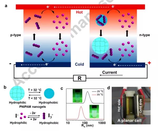 熱原電池(TGC)是將熱能直接轉(zhuǎn)換為穩(wěn)定的電力輸出的有前途的設(shè)備。目前,由于有限的溫差而產(chǎn)生的低電壓(毫伏級(jí))嚴(yán)重阻礙了TGC的實(shí)際應(yīng)用。改善電壓的一種通用策略是交替串聯(lián)連接n型和p型氧化還原單元。但是,可能的氧化還原種類的數(shù)量受到限制,從而阻礙了器件串聯(lián)堆疊的優(yōu)化。在這項(xiàng)工作中,作者報(bào)告了一個(gè)新穎的概念,該概念使得能夠通過聚(N-異丙基丙烯酰胺)(PNIPAM)熱敏納米凝膠誘導(dǎo)的碘化物/三碘化物氧化還原對(duì)進(jìn)行pn轉(zhuǎn)換,塞貝克系數(shù)從0.71 mV/K變?yōu)?1.91 mV/K。結(jié)果證明,納米凝膠能夠在熱側(cè)選擇性捕獲I3-,然后在冷側(cè)釋放I3-,從而產(chǎn)生游離I3-的濃度梯度,從而導(dǎo)致p-n轉(zhuǎn)化。此外,我們?cè)O(shè)計(jì)了一種可穿戴設(shè)備,該設(shè)備由交替的I-/I3-和I-/I3-/納諾格斯串聯(lián)構(gòu)成,通過利用人體熱量產(chǎn)生大約1 V的開路電壓和大約9μW的輸出功率。這項(xiàng)工作開發(fā)了一種新的方法來逆轉(zhuǎn)氧化還原對(duì)的塞貝克效應(yīng),并且對(duì)于擴(kuò)展TGC中可能的氧化還原物質(zhì)的庫非常重要。P-N Conversion in Thermogalvanic Cells Induced by Thermosensitive Nanogels for Body Heat Harvesting.(Nano Energy, 2018, DOI:10.1016/j.nanoen.2018.12.073)