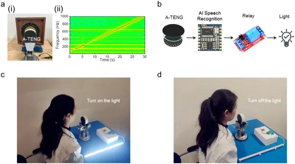(a)在20~1000 Hz范圍內(nèi)對A-TENG聯(lián)合時頻分析的實驗裝置和測量結(jié)果。(b)自供電聲學(xué)AI邊緣系統(tǒng)示意圖。(c-d)在沒有云計算的情況下展示用于實時語音識別的自供電邊緣智能系統(tǒng)。綜上所述,提出了一種3D打印的A-TENG,具有結(jié)構(gòu)可控、一次性成型、制作簡單、成本低的特點。借助于四分之一波長管,在100 dB SPL激勵下,A-TENG可以提供4.33 mW的功率輸出,這足以直接驅(qū)動72個LED和一臺商用計算器。此外,還開發(fā)了基于A-TENG的自驅(qū)動傳感系統(tǒng),用于智能語音識別。該系統(tǒng)包括將語音信號轉(zhuǎn)換為電信號的A-TENG、內(nèi)置并預(yù)先訓(xùn)練好的神經(jīng)網(wǎng)絡(luò)處理傳感信號的AI語音識別芯片和執(zhí)行指令的控制電路。該智能感知組件無需云計算即可在物聯(lián)網(wǎng)的邊緣端實現(xiàn)語音指令識別與控制,是一種低功耗、低成本的智能邊緣系統(tǒng)。通過將TENG與人工智能技術(shù)的結(jié)合,可構(gòu)建更全面的智能自驅(qū)動系統(tǒng),將是令人振奮的發(fā)展方向。這些智能系統(tǒng)可以部署在物聯(lián)網(wǎng)的邊緣,具有獨立于云計算、低功耗、長期運行免維護等優(yōu)勢。