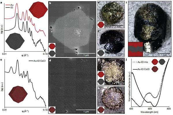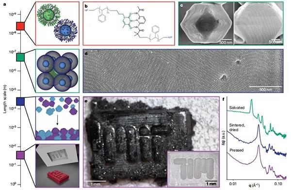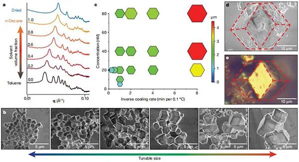 納米顆粒組裝已經(jīng)被提出作為一種理想的方法來構(gòu)建材料的層次組織,通過選擇納米尺度的組件來自下而上構(gòu)建整個材料。多尺度結(jié)構(gòu)控制是非常可取的,這是源于化學(xué)組成、納米尺度順序、微觀結(jié)構(gòu)和宏觀形式都影響物理性質(zhì)。然而,通常決定納米顆粒有序的化學(xué)相互作用,并不能提供任何在更大長度尺度上操縱結(jié)構(gòu)的手段。微觀結(jié)構(gòu)和宏觀形態(tài)仍然是未充分探索的設(shè)計參數(shù),開發(fā)能夠?qū)蝹€自組裝結(jié)構(gòu)結(jié)合成宏觀的加工技術(shù),將是開發(fā)在所有尺寸狀態(tài)下具有完全結(jié)構(gòu)控制的納米顆粒的重要步驟。因此,基于納米顆粒的材料開發(fā)需要在不犧牲其自組裝納米級排列的情況下,定制微觀和宏觀結(jié)構(gòu)的加工策略。其中,納米復(fù)合技術(shù)(NCT)非常適合生產(chǎn)此類分層材料,源于其固有的可伸縮成分組成,并使用動態(tài)結(jié)合相互作用來決定納米顆粒如何排列成有序陣列。每個NCT均由覆蓋有聚合物的無機納米顆粒組成,其中每個聚合物鏈均終止于超分子結(jié)合基團。將溶劑分散的NCT與互補結(jié)合基團混合后,超分子相互作用將顆粒組裝成更大的結(jié)構(gòu)。由于將NCT連接在一起的超分子相互作用是動態(tài)的,因此通過其解離溫度冷卻一系列NCT,可使它們組織成有序的超晶格。然而,由于聚合物鏈在干燥過程中迅速收縮,之前試圖從組裝溶劑中去除晶格的嘗試導(dǎo)致了晶格的混亂。因此,從這些NCTs中形成獨立的宏觀固體,首先需要一些方法來穩(wěn)定它們,以防止在溶劑去除過程中的順序損失。今日,美國麻省理工學(xué)院 Robert J. Macfarlane教授課題組(通訊作者)提出通過逐漸引入與聚合物發(fā)生不利相互作用的非溶劑來穩(wěn)定晶格,以防止聚合物塌陷,與該非溶劑的相互作用將導(dǎo)致鏈采用較致密的構(gòu)型并使晶格收縮。從而演示了快速組裝以克為單位的多面納米顆粒超晶格微晶的方法,利用此方法這些晶體可以類似于塊狀固體的燒結(jié),進一步形成宏觀物體。該方法的關(guān)鍵是:控制納米顆粒組裝的化學(xué)相互作用在后續(xù)處理步驟中保持活性,這使得在形成宏觀材料時,可以保留顆粒的局部納米級有序性。可以根據(jù)超晶格微晶的尺寸,化學(xué)組成和晶體對稱性來調(diào)整固體的納米結(jié)構(gòu)和微觀結(jié)構(gòu),微觀結(jié)構(gòu)和宏觀結(jié)構(gòu)可以通過后續(xù)的加工步驟進行控制。因此,這項工作提供了一種通用的方法,可以同時控制分子到宏觀長度尺度上的結(jié)構(gòu)組織。相關(guān)研究成果以“Macroscopic materials assembled from nanoparticle superlattices”為題發(fā)表在Nature上。