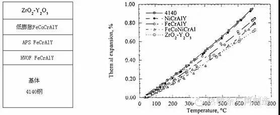 有的多層結(jié)構(gòu)通過采用多種成分涂層來滿足一種性能要求,例如,為了開發(fā)出能夠滿足柴油發(fā)動機用的長壽命厚熱障涂層,Robert等采用了熱膨脹系數(shù)非常接近的三層結(jié)合底層來降低涂層熱應(yīng)力,其涂層結(jié)構(gòu)如圖所示,各層涂層的熱膨脹行為如右圖所示。由于基體材料4140、NiCrAlY、FeCrAlY、FeCoNiCrAl和ZrO2-Y2O3之間膨脹系數(shù)屬于逐漸變化的,從而可以大幅度減小ZrO2-Y2O3涂層與基體之間的熱膨脹不匹配性,從而達到減小熱應(yīng)力、延長使用壽命的目的。