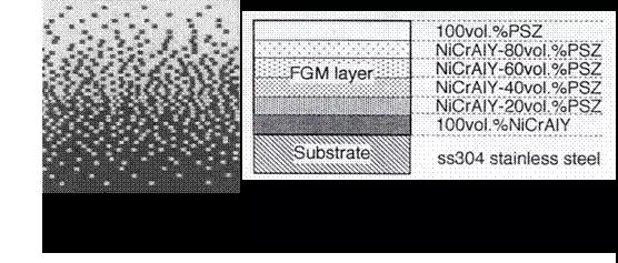 在熱障涂層中,由于粘結(jié)層金屬和氧化鋯陶瓷的熱膨脹系數(shù)差異較大,這種差異將導(dǎo)致涂層內(nèi)應(yīng)力過大,并且在熱循環(huán)條件下常發(fā)生陶瓷涂層的早期破壞。為了減小內(nèi)應(yīng)力,提高涂層與基體的結(jié)合強度,材料科學(xué)家開始在常規(guī)熱障涂層中引入功能梯度材料制備技術(shù)。
