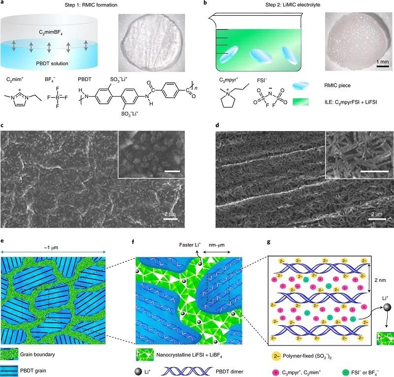 固態(tài)聚合物電解質(zhì)(SPEs)在復(fù)興高能量密度鋰(Li)基電池方面受到了廣泛的關(guān)注。雖然鋰離子電池(LIBs)因其相對(duì)較高的比能量和功率密度在儲(chǔ)能領(lǐng)域發(fā)揮著重要作用,但是它們正接近理論極限(約400 Wh kg-1)。目前,研究人員主要集中在新型電極材料上,以提高Li基電池的容量。在正極方面,鋰-空氣電池和鋰-硫電池是主要的前沿候選電池。在負(fù)極處,鋰金屬可以代替石墨,使負(fù)極能量密度提高約10倍。然而,在長(zhǎng)期的充放電循環(huán)過(guò)程中,電極的發(fā)展需要一種能夠阻止不可逆反應(yīng)和枝晶生長(zhǎng)的電解質(zhì)。其中,SPEs不僅提供機(jī)械剛度來(lái)阻止枝晶,而且提供比液體電解質(zhì)更安全的操作。基于極硬的雙螺旋磺化芳香聚酰胺與離子液體(IL)和鋰鹽組合的固態(tài)分子-離子復(fù)合(MIC)電解質(zhì),通過(guò)改變聚合物含量、離子類型、金屬鹽類型和負(fù)載量,可以廣泛地調(diào)節(jié)MIC的性能。研究人員開(kāi)發(fā)了許多基于IL的凝膠電解質(zhì)(離子凝膠或離子凝膠),將IL的不可燃性與機(jī)械支撐基質(zhì)結(jié)合起來(lái)。然而,這些凝膠只有在摻雜有機(jī)電解質(zhì)時(shí)才顯示出實(shí)際的鋰金屬循環(huán)性能,有機(jī)電解質(zhì)提高了導(dǎo)電性,但引入了揮發(fā)性液體,降低了過(guò)熱和火災(zāi)的安全性。