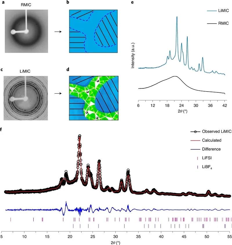 近日,美國(guó)弗吉尼亞理工學(xué)院與州立大學(xué)Louis A. Madsen(通訊作者)等人報(bào)道了一種固態(tài)MIC電解質(zhì),其不含揮發(fā)性溶劑,且顯示出高離子導(dǎo)電性、有利電極-電解質(zhì)接觸和高熱穩(wěn)定性,同時(shí)具有足夠的模量作為L(zhǎng)i金屬電池的隔膜。在電解質(zhì)中加入Li鹽可以增加Li離子的導(dǎo)電性,并且為電極上的反應(yīng)提供Li離子。通過(guò)實(shí)驗(yàn)表明,在包含N-丙基-N-甲基吡咯烷雙(氟磺酰基)酰亞胺(C3mpyrFSI)與LiFSI(3.2 mol kg-1)的離子液體電解質(zhì)(ILEs)中,Li金屬的循環(huán)速率很高。基于與離子液體和濃鋰鹽結(jié)合的取向液晶聚合物的分子離子復(fù)合電解質(zhì),不僅實(shí)現(xiàn)高Li密度、高強(qiáng)度(200 MPa)和不可燃性,而且具有出色的Li+電導(dǎo)率(在25 °C時(shí)為1 mS cm-1)和電化學(xué)穩(wěn)定性(對(duì)比Li|Li+為5.6 V),同時(shí)抑制了枝晶的生長(zhǎng)且表現(xiàn)出較低的界面電阻(32 Ω cm2),以及在Li對(duì)稱電池循環(huán)過(guò)程中顯示出過(guò)電位(在1 mA cm-2時(shí)≤120 mV)。異質(zhì)鹽摻雜工藝會(huì)修改局部有序的聚合物離子組裝,以結(jié)合填充有缺陷的LiFSI和LiBF4納米晶體的晶間網(wǎng)絡(luò),從而極大增強(qiáng)Li+傳輸。總之,這種模塊化材料制造平臺(tái)將陶瓷類導(dǎo)體的快速傳輸與聚合物電解質(zhì)的優(yōu)異柔性結(jié)合起來(lái),為安全、高能量密度的能量存儲(chǔ)和轉(zhuǎn)換應(yīng)用提供了前景。研究成果以題為“Solid-state rigid-rod polymer composite electrolytes with nanocrystalline lithium ion pathways”發(fā)布在國(guó)際著名期刊Nature Materials上。