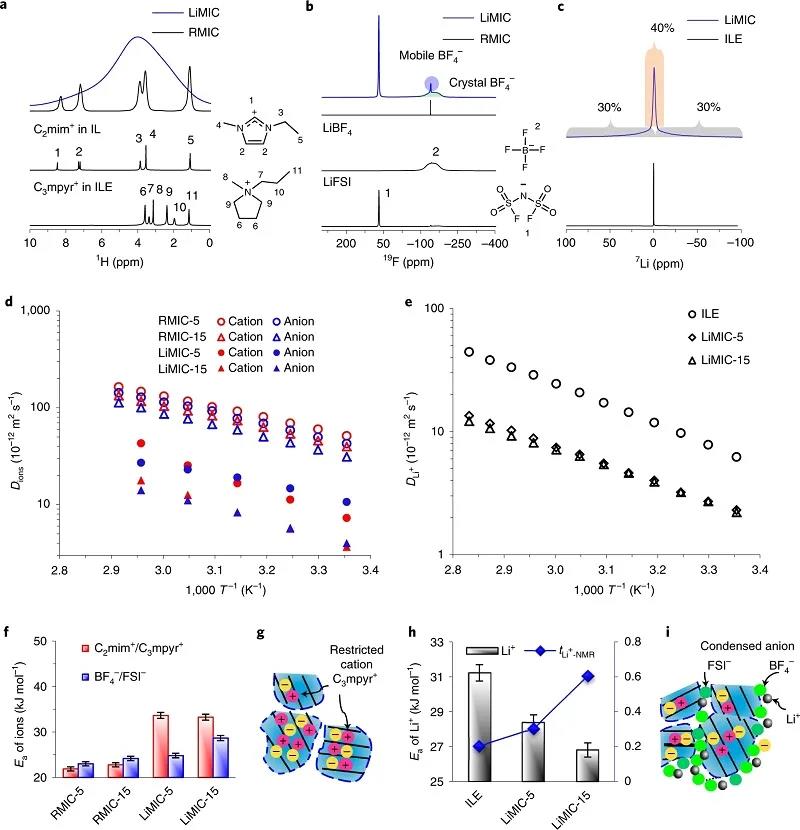 (a)純IL(C2mimBF4)、ILE(C3mpyrFSI和50 mol%LiFSI)、RMIC和LiMIC中陽(yáng)離子的1H NMR光譜;