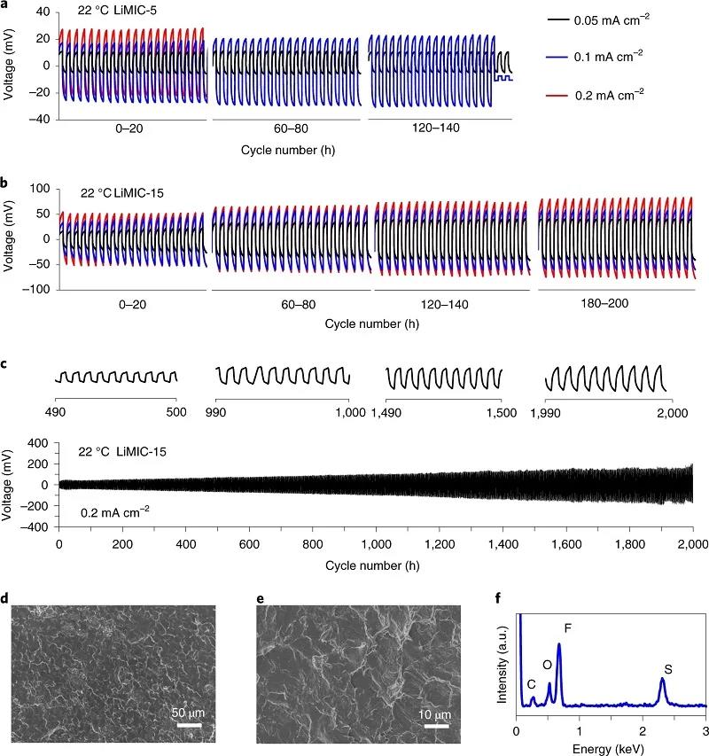 (d-e)使用LiMIC-15作為電解質(zhì)和隔膜,在c所示的2000 h長(zhǎng)期循環(huán)后,拆卸后的Li金屬電極的放大倍數(shù)SEM圖像;